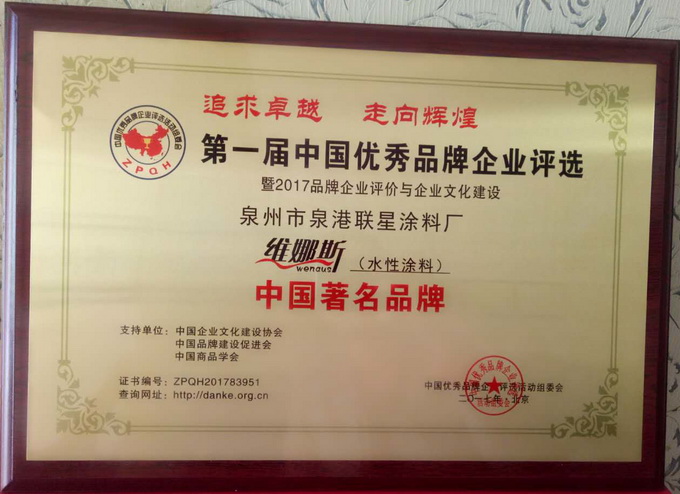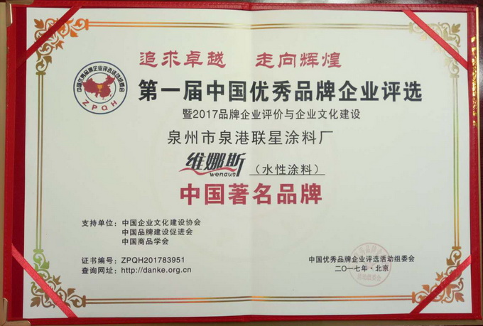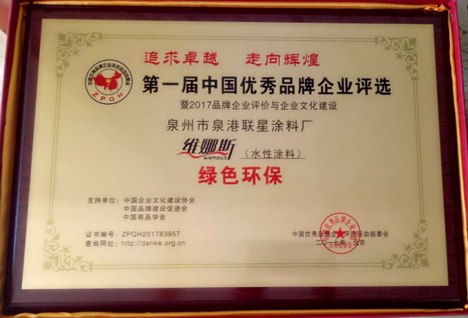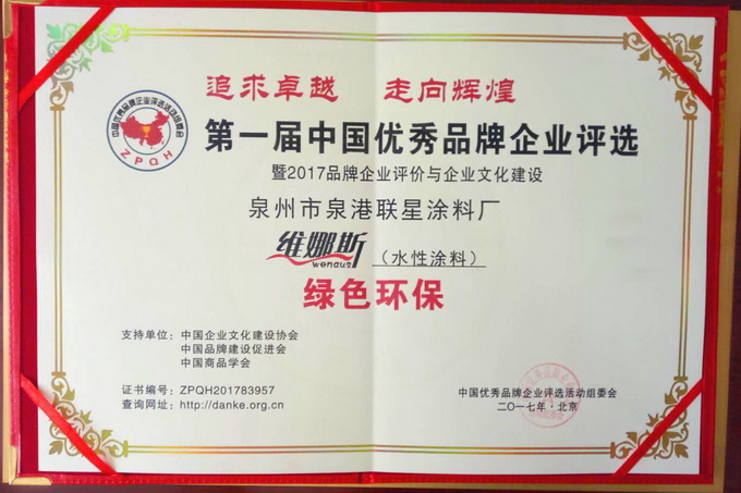 由中國企業(yè)文化建設(shè)協(xié)會、中國品牌建設(shè)促進(jìn)會、中國商品協(xié)會等聯(lián)合主辦的“第一屆中國優(yōu)秀品牌企業(yè)評選”,暨2017品牌企業(yè)評價與企業(yè)文化建設(shè)年度評選頒獎典禮,聯(lián)星漆業(yè)榮獲——“優(yōu)秀品牌企業(yè)”,頻頻獲得榮譽(yù)的央視品牌”維娜斯“也再一次榮獲——“綠色環(huán)保品牌”、“中國著名品牌”!!!
